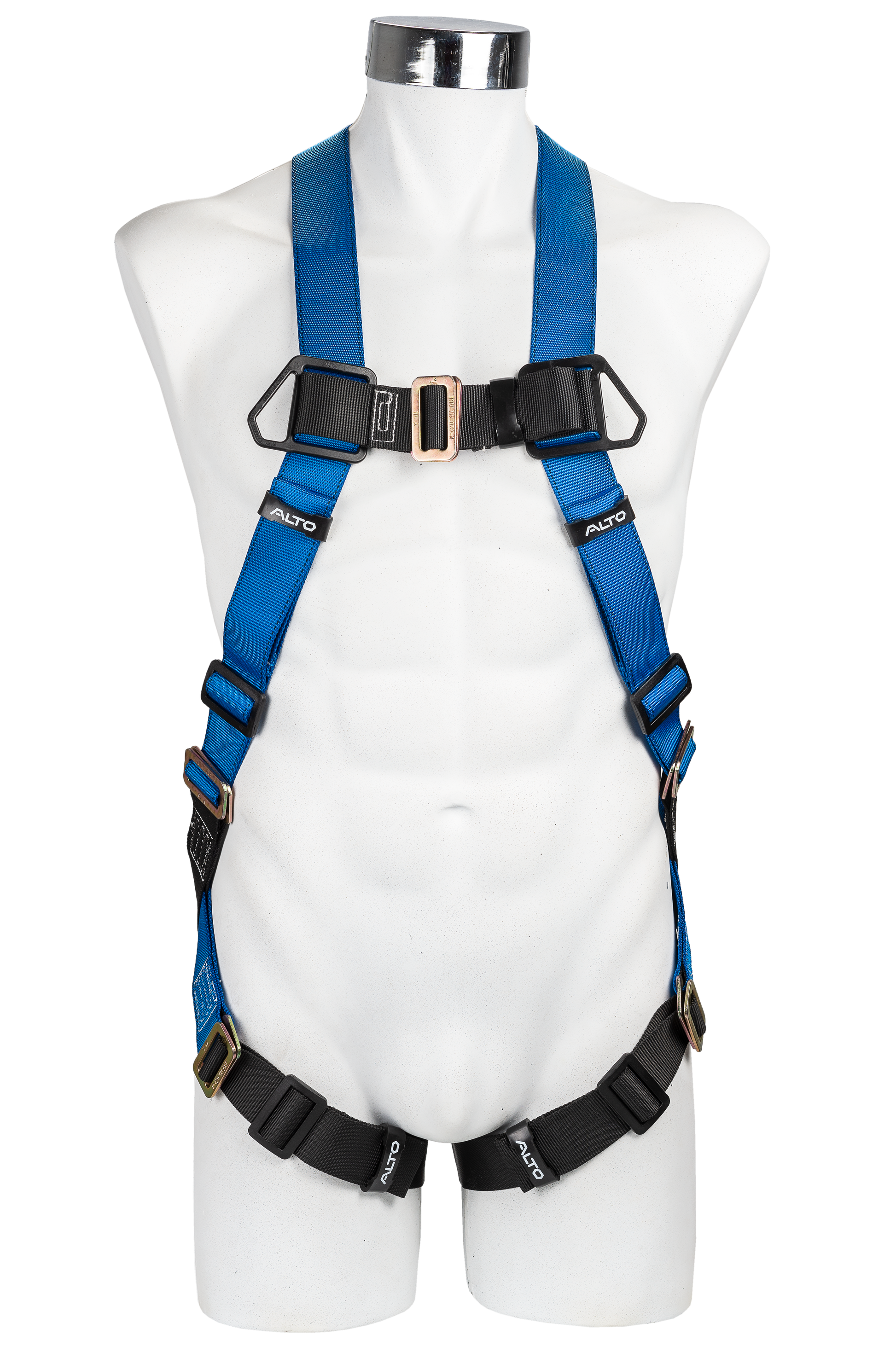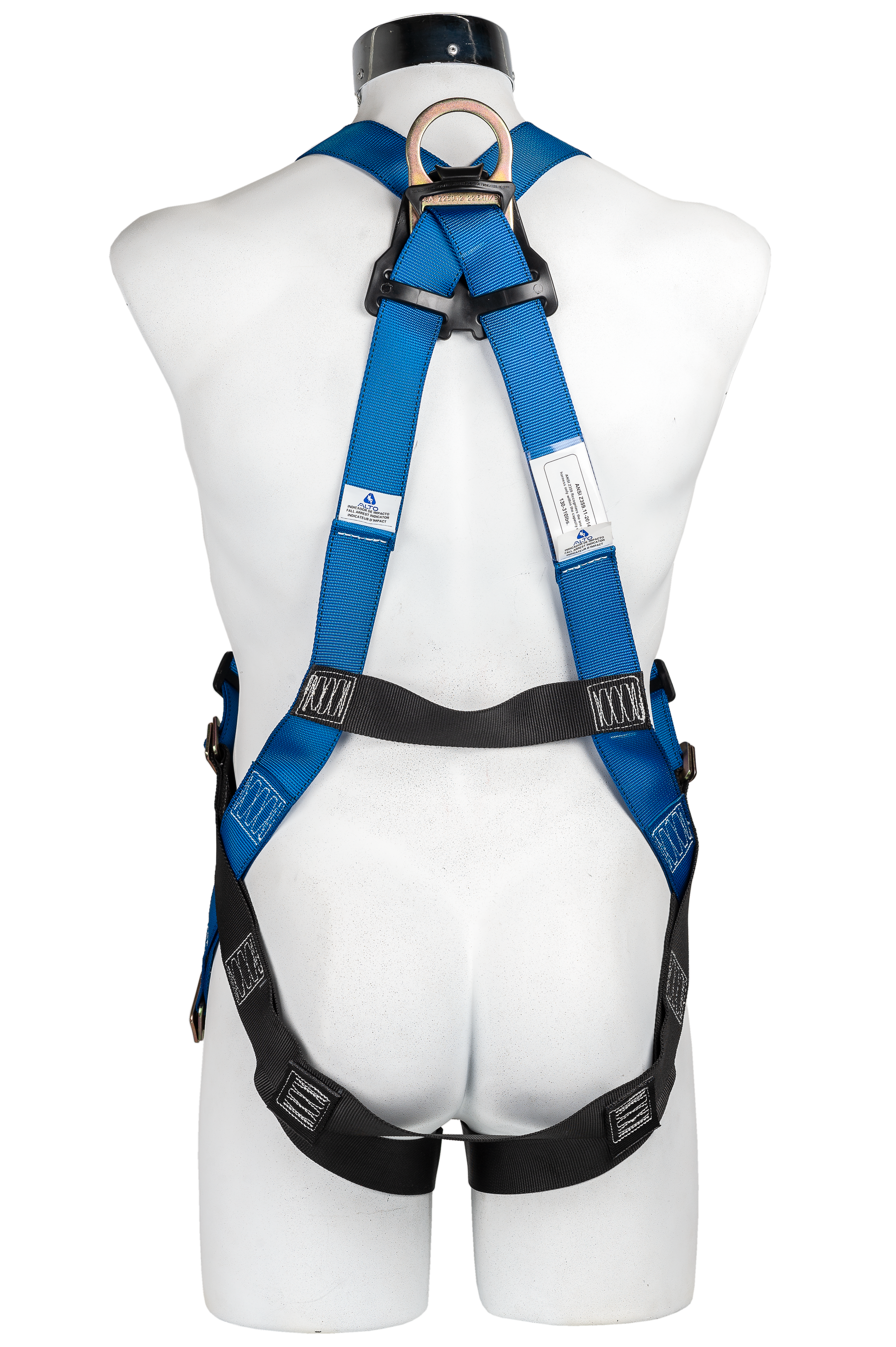 Arnés contra caídas tipo H, equipado con un (1) anillo estampado tipo “D” en la zona dorsal y hebillas de acero tropicalizado de alta resistencia al impacto. Fabricado con cintas de poliéster durables, cuenta con herrajes plásticos para sujetar el excedente de cinta y etiquetado personalizado conforme a la normativa vigente.