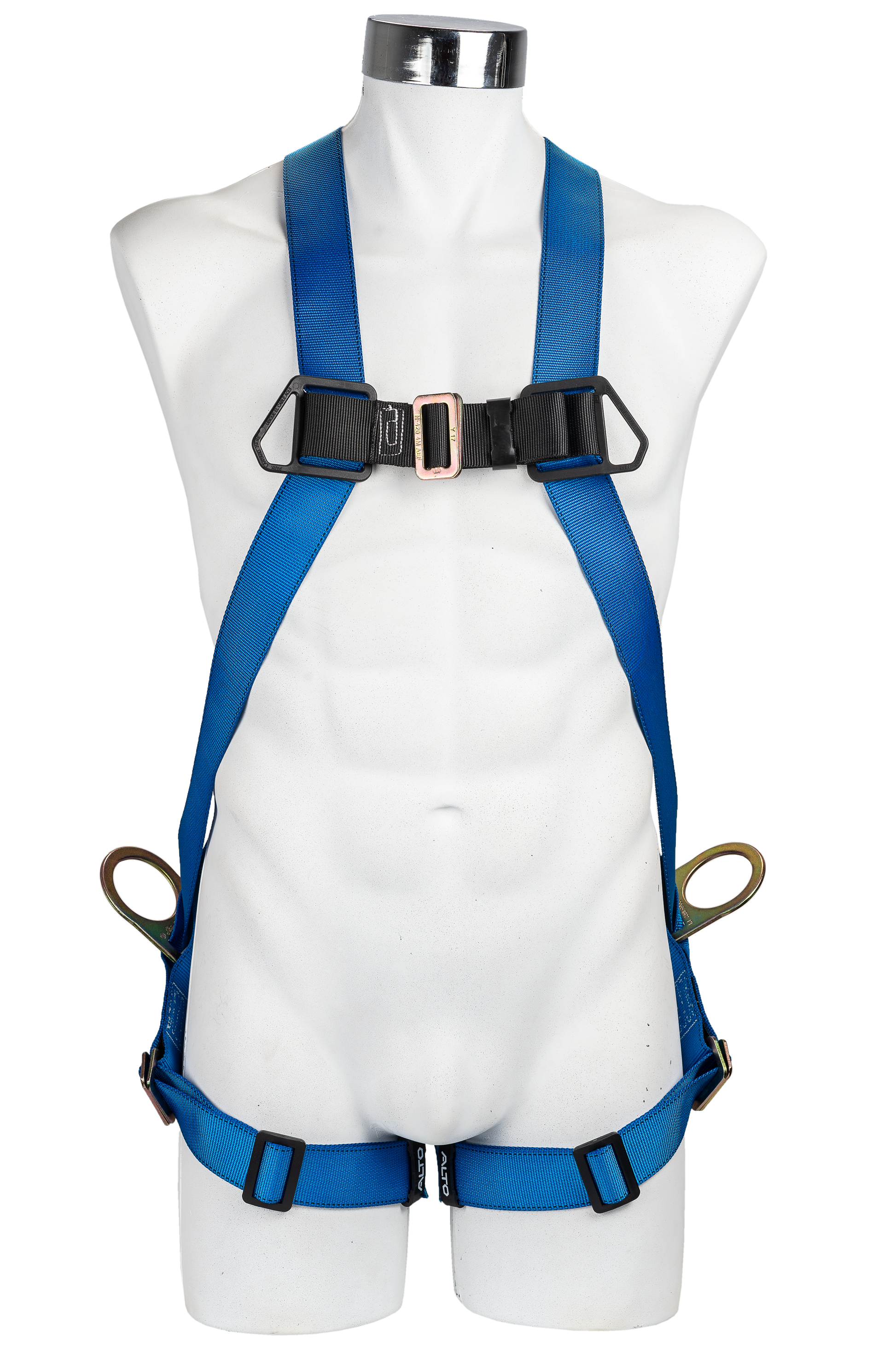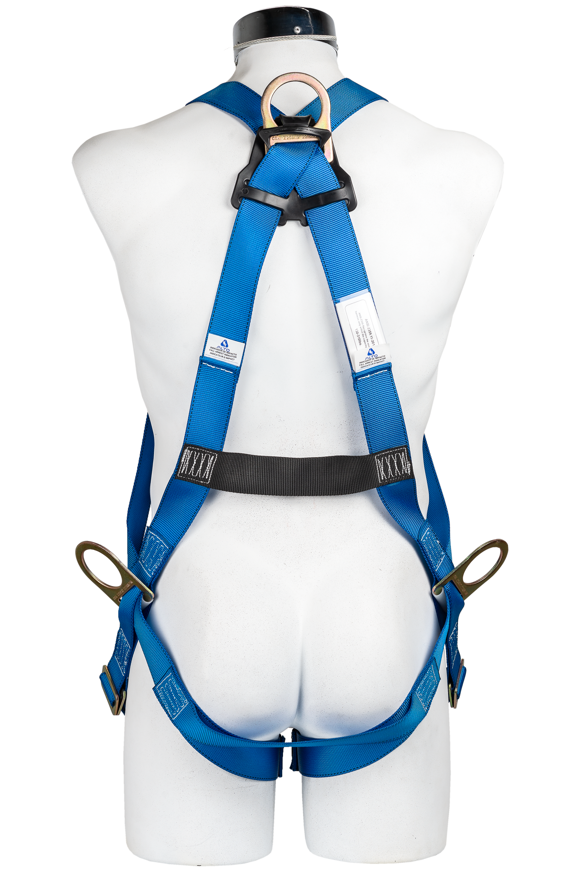 Arnés contra caídas, cuenta con un (1) anillo “D” en la zona dorsal para sistemas contra caídas, y dos (2) anillos metálicos a la altura de la cadera, para sistemas de posicionamiento, hebillas de acero tropicalizado de alta resistencia al impacto. Fabricado con cintas de poliéster durables, cuenta con herrajes plásticos para sujetar el excedente de cinta y etiquetado personalizado conforme a la normativa vigente.